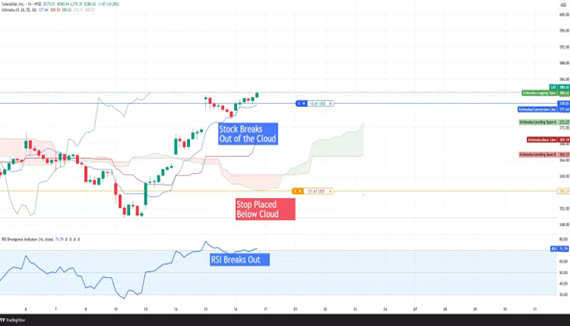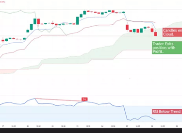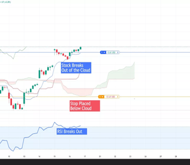 A stock trader utilizing the Ichimoku Cloud and Relative Strength Index (RSI) to capitalize on short term trends identifies a bullish breakout, as price moves above the Cloud while the RSI breaks out, confirming upward momentum. Seizing the opportunity, the trader enters a long position, placing a stop just below the Cloud.