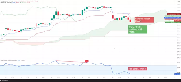 The trend continues to deteriorate, with a bearish crossover of the Conversion Line and the Base Line, followed by a candle closing inside the Cloud and the RSI dropping below 50, confirming loss of bullish momentum. Recognizing these trend reversal signals, the trader exits the position profitably, avoiding further downside risk.